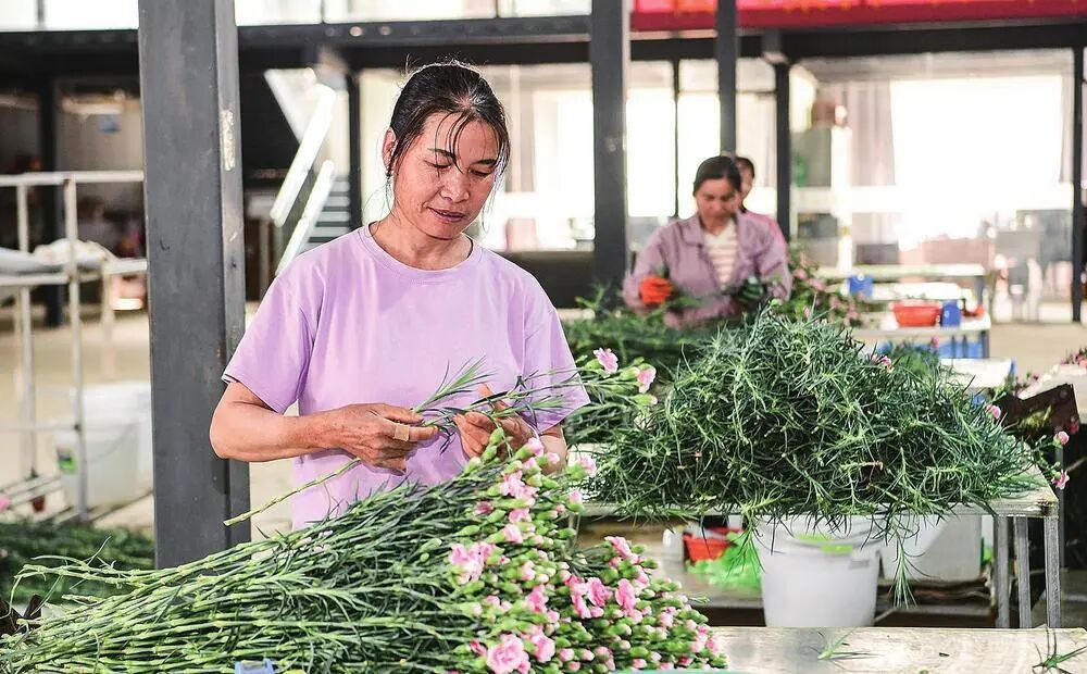 此时,在位于龙泉街道罗所社区的易门美天娇花卉有限公司,工人们正紧张有序地打包着鲜花。