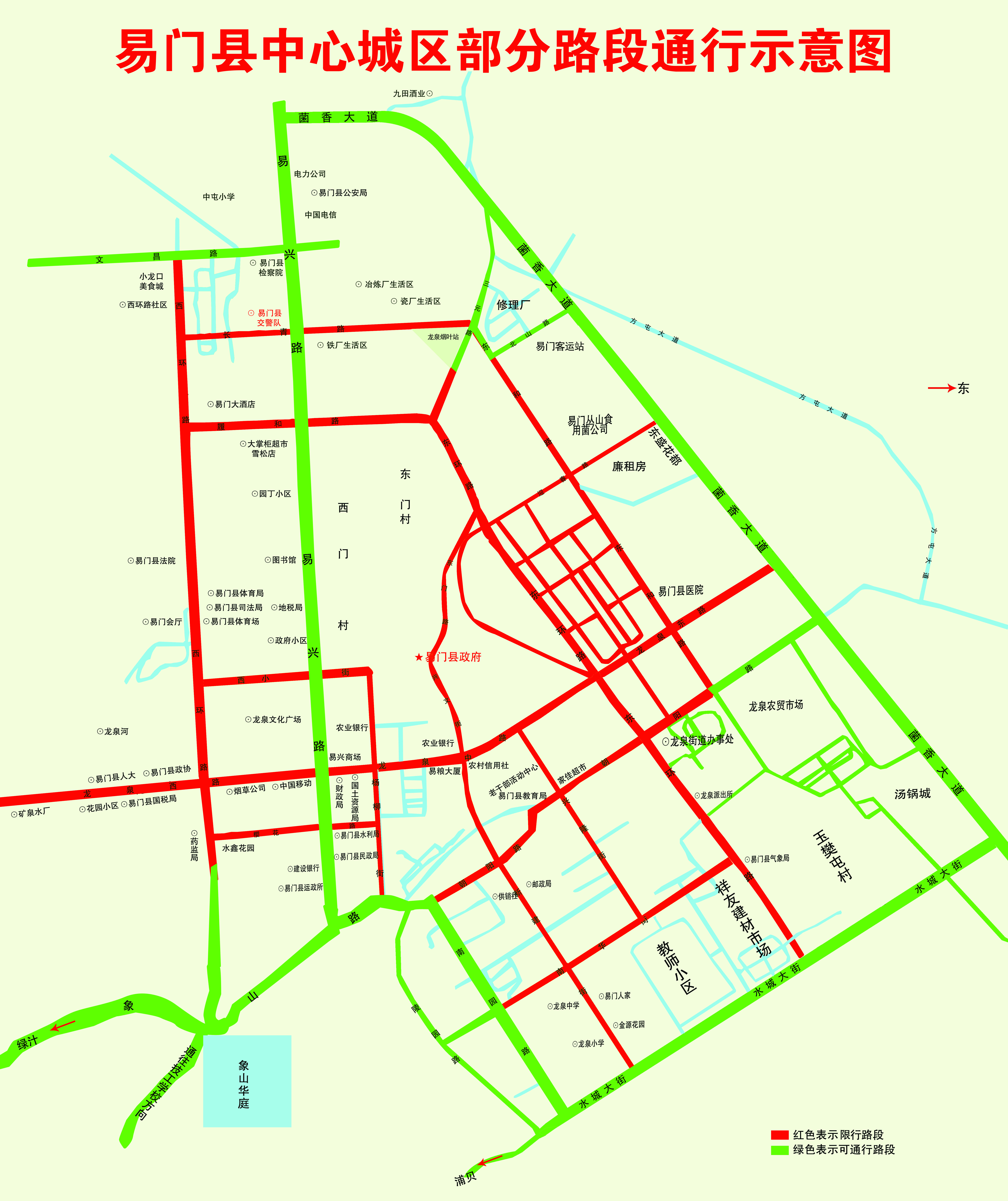 一、下列路段自2020年9月14日起每天7:00至21:30限制大中型货车、轻型货车(核定载质量750千克以上)、低速载货汽车、拖拉机、畜力车通行(特种车辆除外),确需驶入该限制通行路段的车辆(工程抢险车等车辆),应当到易门县公安局交通警察大队办理临时通行手续,并按规定的时间和路线行驶。